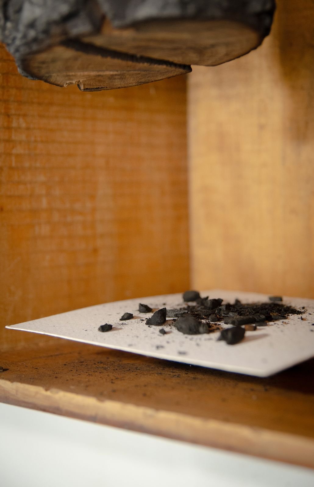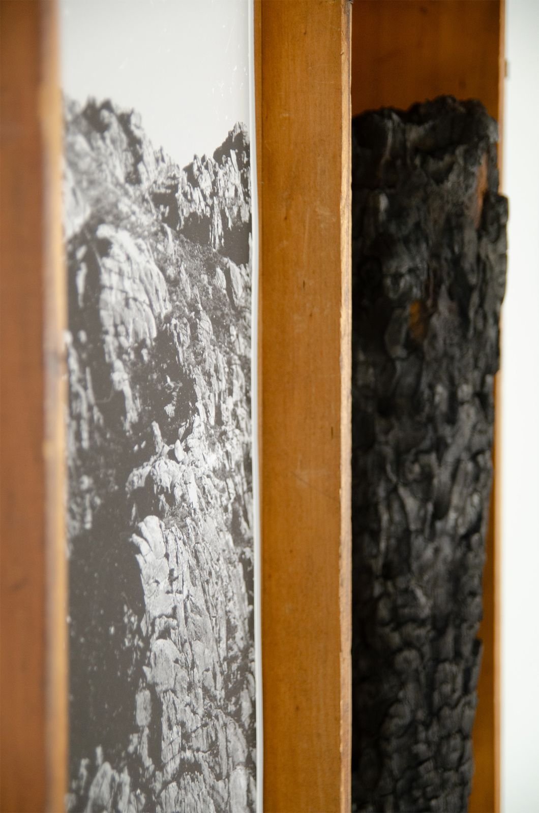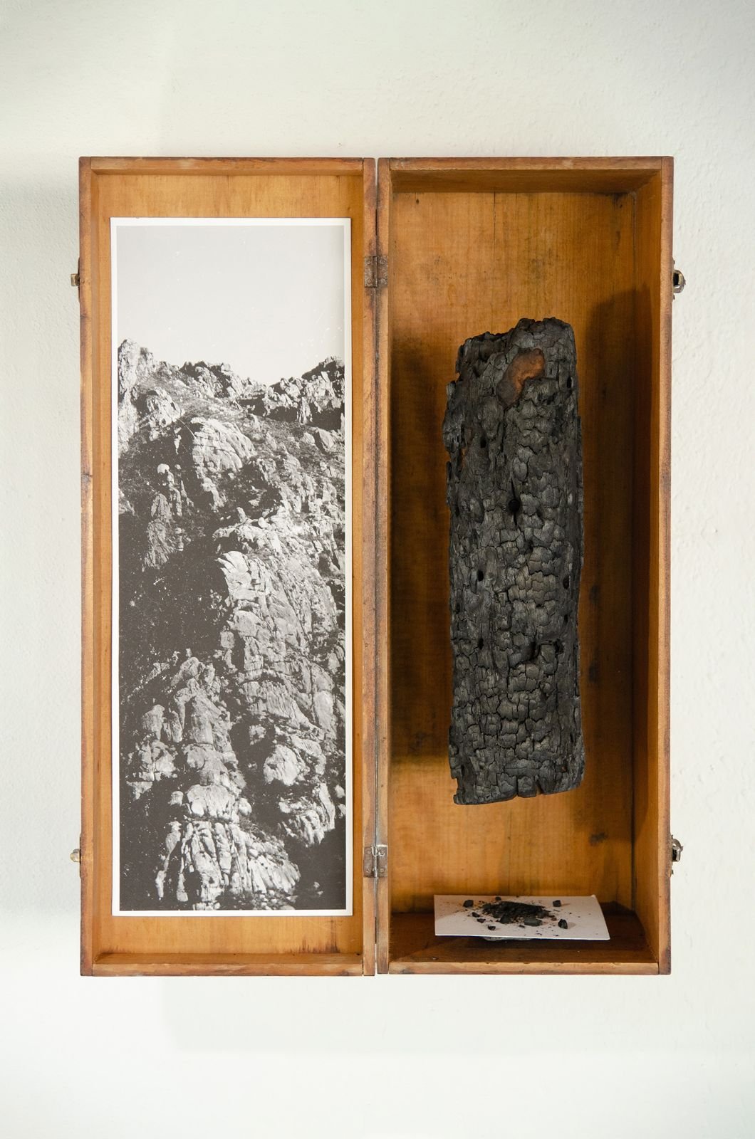 Todo lo que emerge se desvanece reúne dos fragmentos del paisaje donde habito: un tronco quemado y una fotografía de las Sierras de los Comechingones, ambos dispuestos dentro de un cajón de madera. Uno parece permanecer, el otro desintegrarse.